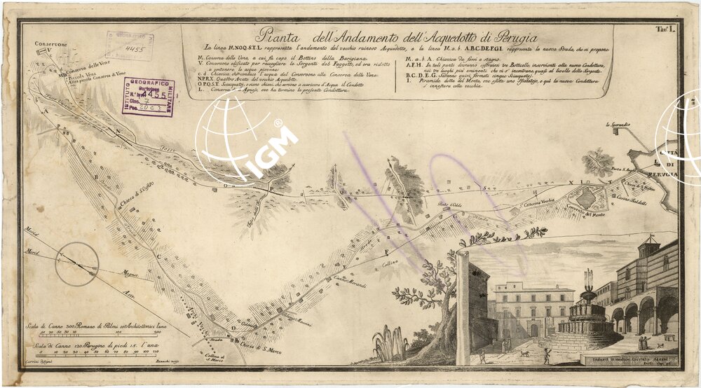 Pianta incisa su rame da Secondo Bianchi su disegno di Giovanni Cerrini. In alto indicazioni relative alla pianta con richiami alfabetici. Annesso una tavola delle stesse dimensioni, disegnata ed incisa dagli stessi autori, con i profili dell’antico e del nuovo acquedotto.