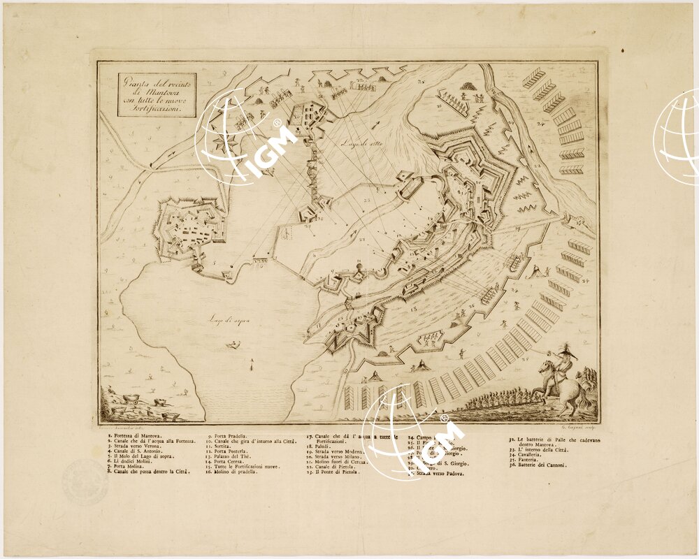 Incisione su rame di G. Gajani, su disegno di Saverio Sammeber. Orientazione: nord spostato verso sinistra di circa 45°. V’è inserito un elenco numerico delle costruzioni principali. La carta si riferisce all’assedio subito da Mantova durante la guerra di successione polacca (1735).