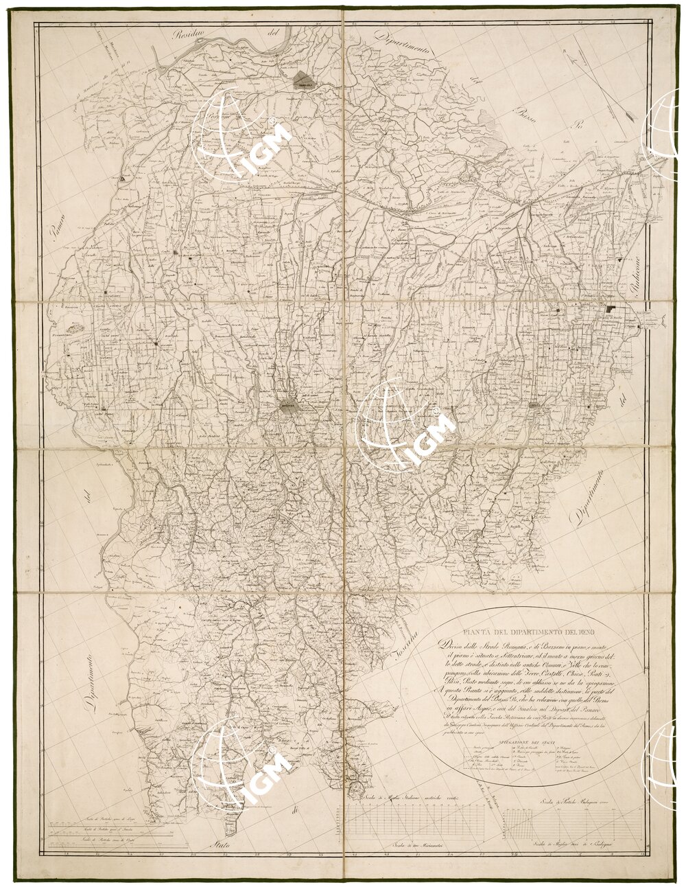 DIVISO DALLE STRADE ROMANA, E DI BAZZANO IN PIANO, E MONTE, IL PIANO E’ SITUATO A SETTENTRIONE ED IL MONTE A MEZZO GIORNO DELLE DETTE STRADE, E DISTINTO NELLE ANTICHE COMUNI, E VILLE CHE LO COMPONGONO, COLLA UBICAZIONE DELLE TERRE, CASTELLI, CHIESE, PONTI, PASSI, POSTE MEDIANTE SEGNI, DI CUI ABBASSO SE NE DA’ LA SPIEGAZIONE. A QUESTA PIANTA SI E’ AGGIUNTO COLLE SUDDETTE DISTINZIONI, LA PARTE DEL DIPARTIMENTO DEL BASSO PO, CHE HA LA RELAZIONE CON QUELLO DEL RENO IN AFFARI ACQUE, E COSI’ DEL FINALESE NEL DIPARTIMENTO DEL PANARO. IL TUTTO RILEVATO COLLA TAVOLA PRETORIANA DA VERI PERITI IN DIVERSE OCCORRENZE E DELINEATO DA GIUSEPPE CANTONI INGEGNERE DELL’UFFIZIO CENTRALE DEL CENSO DEL DIPARTIMENTO DEL RENO E DA LUI PUBBLICATA A SUE SPESE (s. d.).