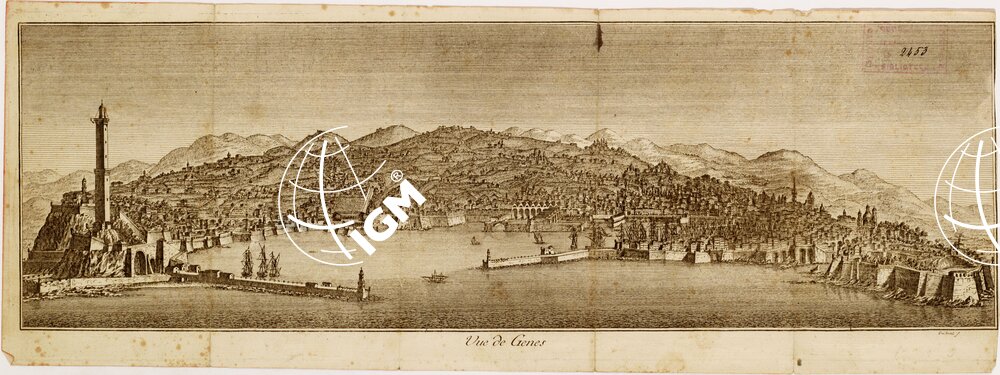 Veduta panoramica di Genova. Un foglio inciso su rame. Rappresentazione orografica prospettica. Grafia in francese.