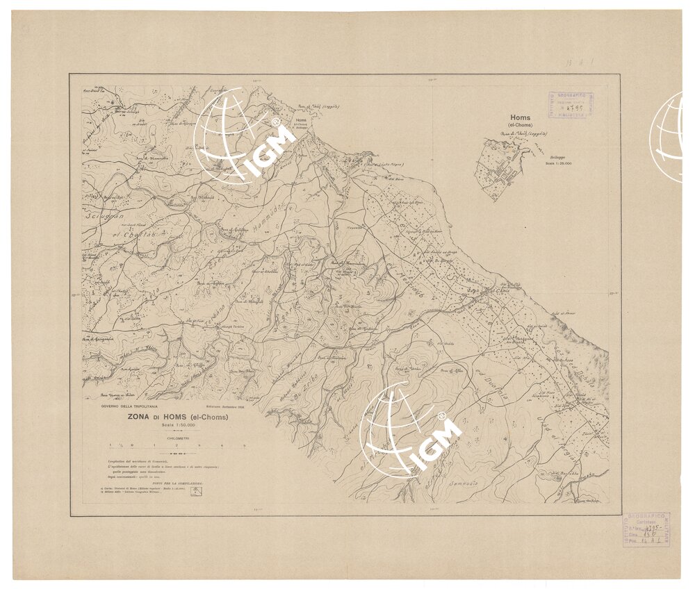 Un foglio stampato in nero, ricavato dai rilievi dell’I.G.M. Orografia dimostrata a curve di livello tracciate all’equidistanza di 50 m., sussidiate da curve dimostrative punteggiate. In alto uno “sviluppo” di Homs al 25.000.
