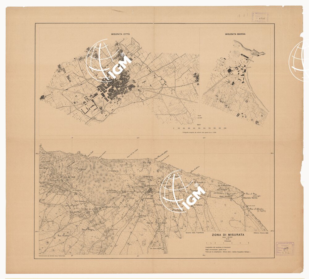 Un foglio in tipolitografia in nero, ricavato da rilievo dell’I.G.M. In alto cartine sussidiarie di Misurata città e Misurata marina, tratte da fotografie eseguite da velivoli alla quota di 200 m.