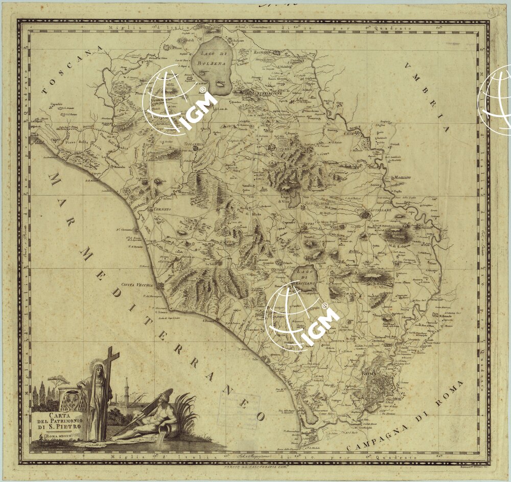 Un foglio tratto da inisione su rame, stampato in nero. L’orografia vi è rappresentata a monticelli. Gli abitati sono rappresentati schematicamente in pianta. Sono tracciate le strade: sono indIcate le vegetazioni. In basso a sinistra il titolo con figure allegoriche. Limiti: nord, Bolsena; sud Foce del Tevere; ovest, la costa Tirrena fino ai confini con la Toscana; est, il corso del Tevere.