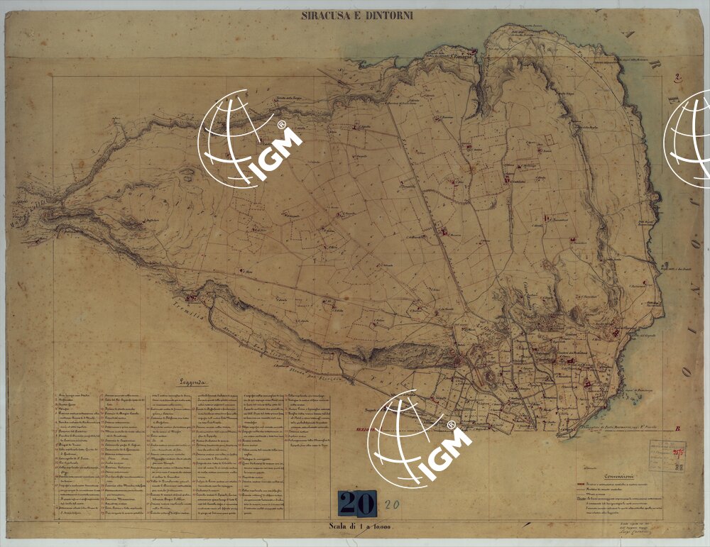 Docum. 20. Due fogli firmati rispettivamente dall’Ing. G. Bosco e L. Cavalieri, disegnati a colori rosso per le costruzioni, azzurro per le acque, con orografia dimostrata mediante curve di livello tracciate all’equidistanza di m. 10 e tratteggio (rocce). Il foglio settentrionale è corredato di elenco numerico delle principali costruzioni. Annessi tre lucidi e una riproduzione fotografica del foglio settentrionale eseguito dall’I.G.M. nel 1913.