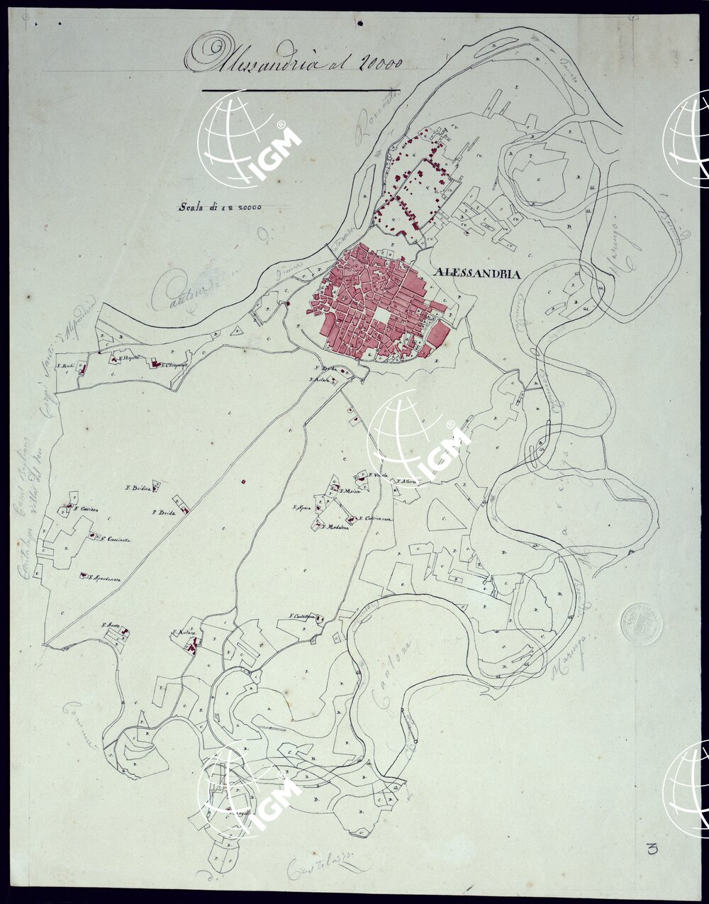 Il titolo non è presente sulla carta. Gruppo di 51 mappe catastali di diversi comuni, impiegate con tutta probabilità per la costruzione della carta generale degli Stati Sardi al 50.000. Senza firma, eccetto due, firmate da Lagrange, una riduzione del piano catastale del territorio d’Ivrea firmato Valsecchi 1822, e una riproduzione dei piani catastali di comuni della provincia d’Ivrea firmata Cap. Roggero.