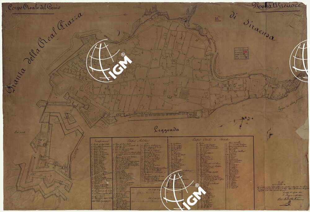 In basso è riportata una dettagliata legenda dei siti principali e i nomi degli autori. Edita dal Corpo Reale del Genio, Nona Direzione.
