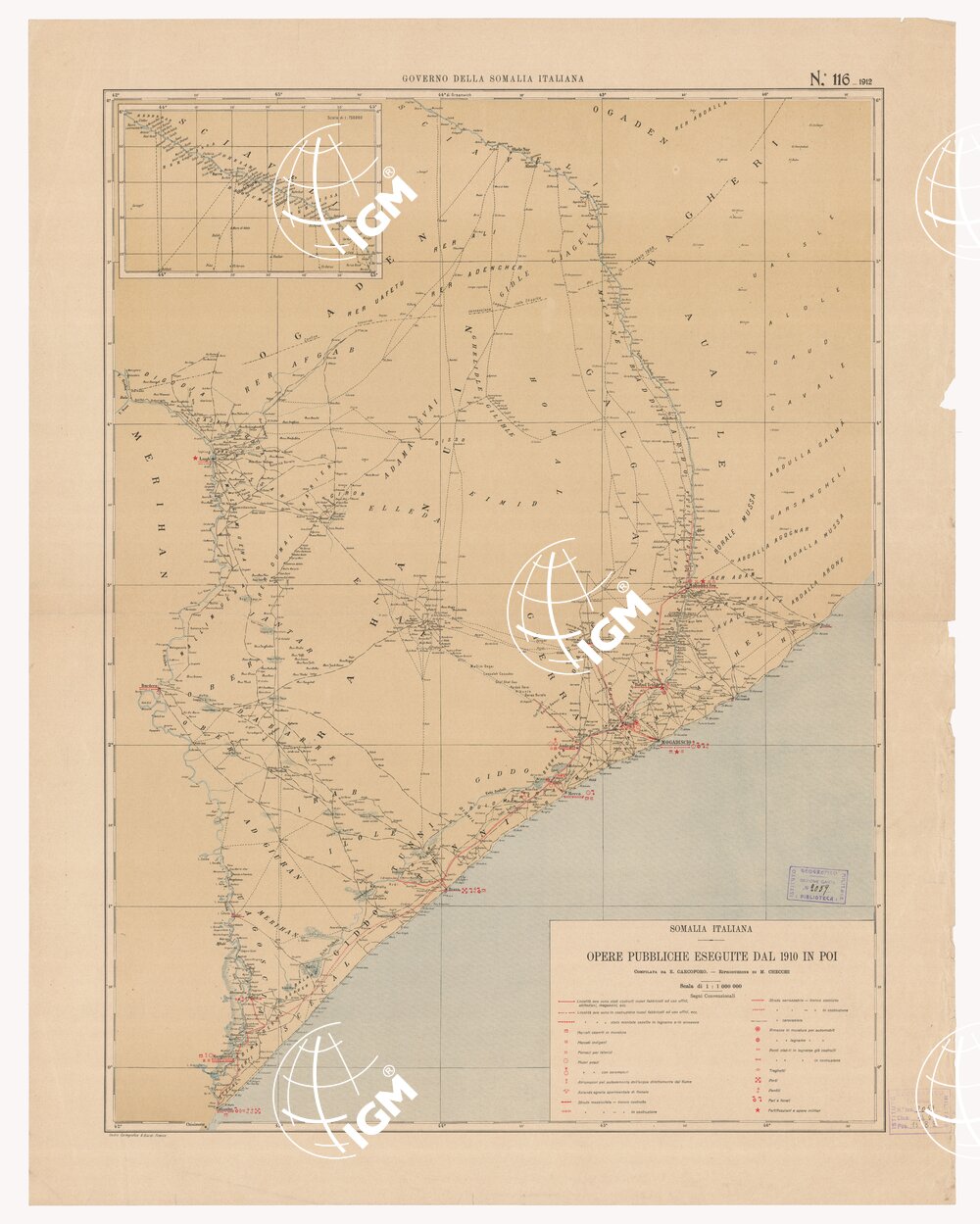 É la stessa carta di cui al N. 13 d’ordine (N. 2058 d’inventario generale), su la quale è riportata la situazione a tutto il 1912 dei lavori pubblici compiuti nella Colonia. La dimostrazione è fatta mediante numerosi segni convenzionali di cui è data la leggenda sul foglio stesso. Compilazione di E. Carcoforo. Riproduzione di M. Checchi.