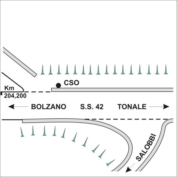 [{"simbolo_contrassegno":"B1","materializzazione":"(CSO) – Bullone infisso all'esterno del muro a retta di valle della statale posto all'altezza del bivio per Salobbi nella testa rivolta a Bolzano."}]