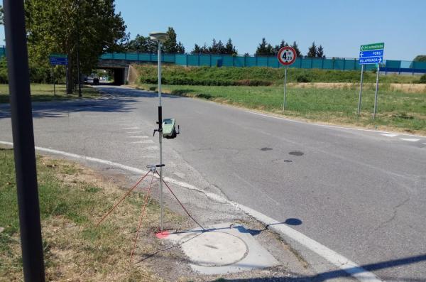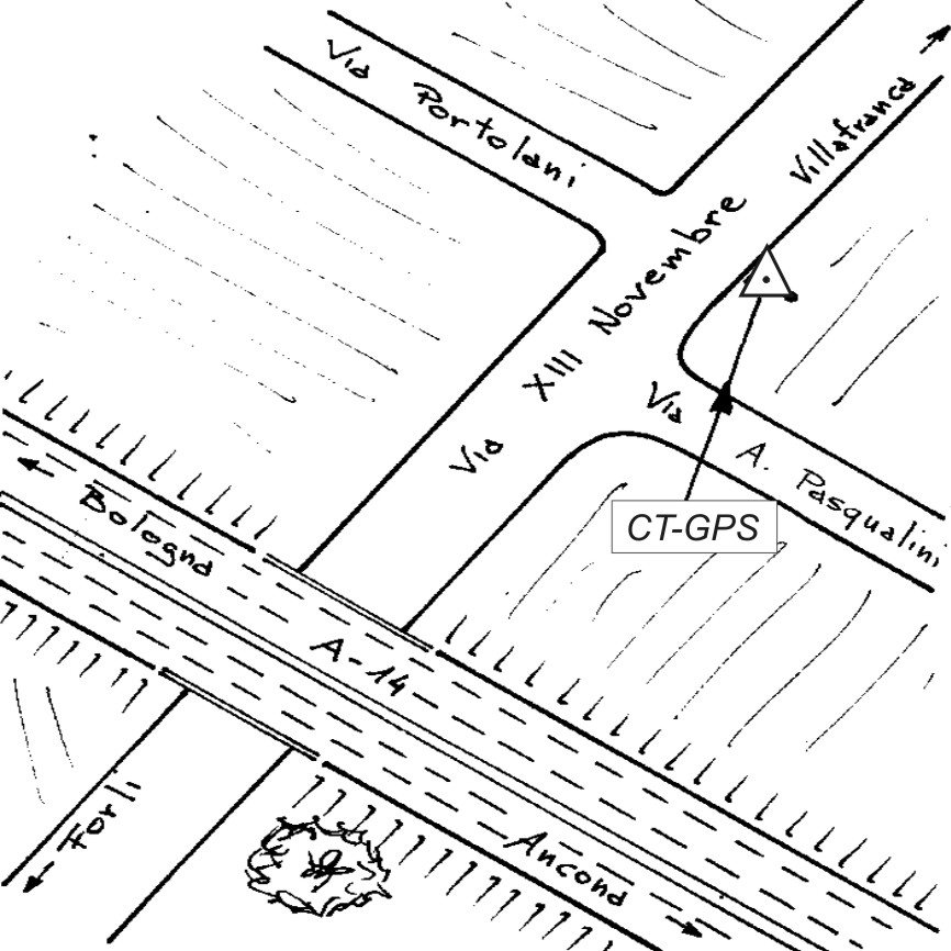 | Materializzazione | Centrino in acciaio inox del tipo "universale" infisso in corrispondenza dello spigolo del tombino in cemento posto al margine di Via XIII Novembre in prossimità dell'incrocio con Via Pasqualini in località Roncadello. |