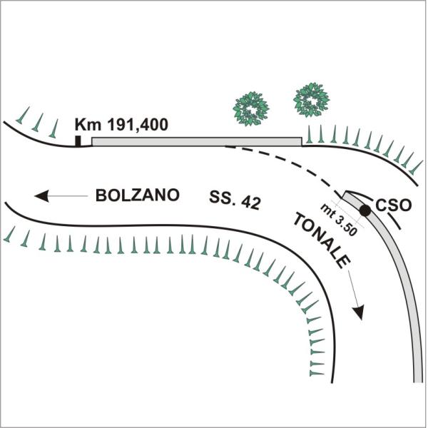 | Contrassegni | [{"simbolo_contrassegno":"B4","materializzazione":"(CSO) – Centrino universale infisso alla sommit\u00e0 del muro di sostegno del guard-rail di valle a circa m 3,50 dalla testa rivolta a Bolzano nella vicinanza di un accesso carrabile."}] |