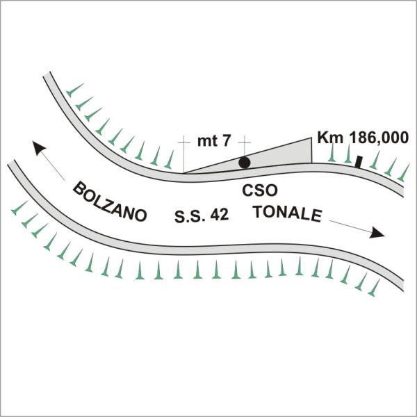 | Contrassegni | [{"simbolo_contrassegno":"B4","materializzazione":"(CSO) – Centrino universale infisso alla sommit\u00e0 del muro di contenimento di valle della statale posto all'altezza del km 186,000 a circa 7 metri dal lato rivolto a Bolzano."}] |