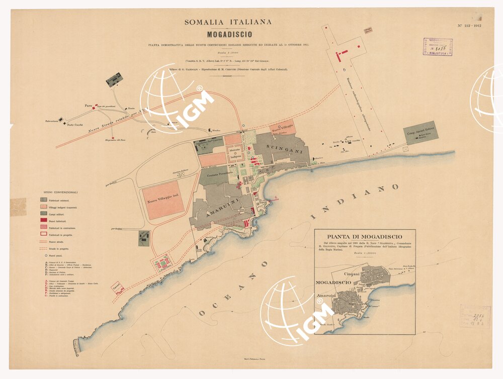Un foglio a colori con inserito un elenco dei principali fabbricati e una piantina sussidiaria di Mogadiscio dal rilievo eseguito nel 1908 dalla R. Nave “Staffetta”, alla scala di 1:10.000.