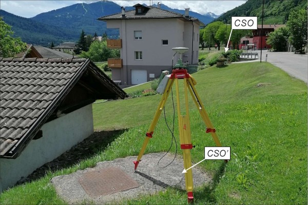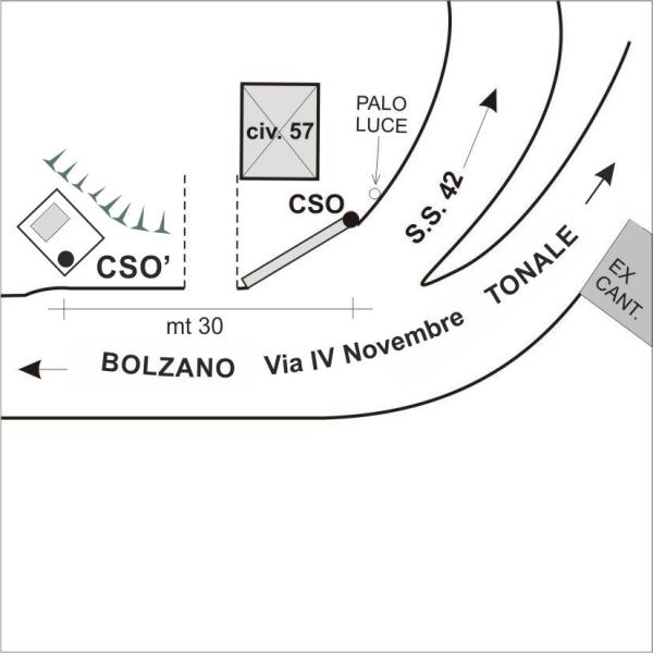 [{"simbolo_contrassegno":"B1","materializzazione":"(CSO) – Bullone infisso nella testa del muro di sostegno di valle nel lato rivolto verso Dimaro."},{"simbolo_contrassegno":"B4","materializzazione":"(CSO') – Centrino in acciaio inox del tipo universale infisso su piattaforma in cemento, in corrispondenza dello spigolo NO, di un tombino in ghisa, posto sul margine di via IV Novembre."}]
