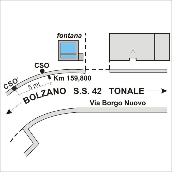 | Contrassegni | [{"simbolo_contrassegno":"B1","materializzazione":"(CSO) – Bullone infisso all'esterno del muro di sostegno del guard-rail posto in prossimit\u00e0 della fontana all'altezza del km 159,800."},{"simbolo_contrassegno":"B4","materializzazione":"(CSO') -centrino in acciaio inox di tipo universale infisso sul basamento del guard rail, a destra in direzione Dimaro\/Bolzano."}] |