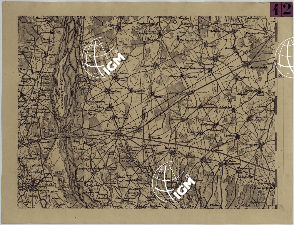 Ingrandimento meccanico al 50.000 delle carte alla scala di 1:86.400 pubblicate dall'I.G.M. Austriaco. Lavoro ordinato dal Comando dello S.M. Italiano e lasciato interotto.