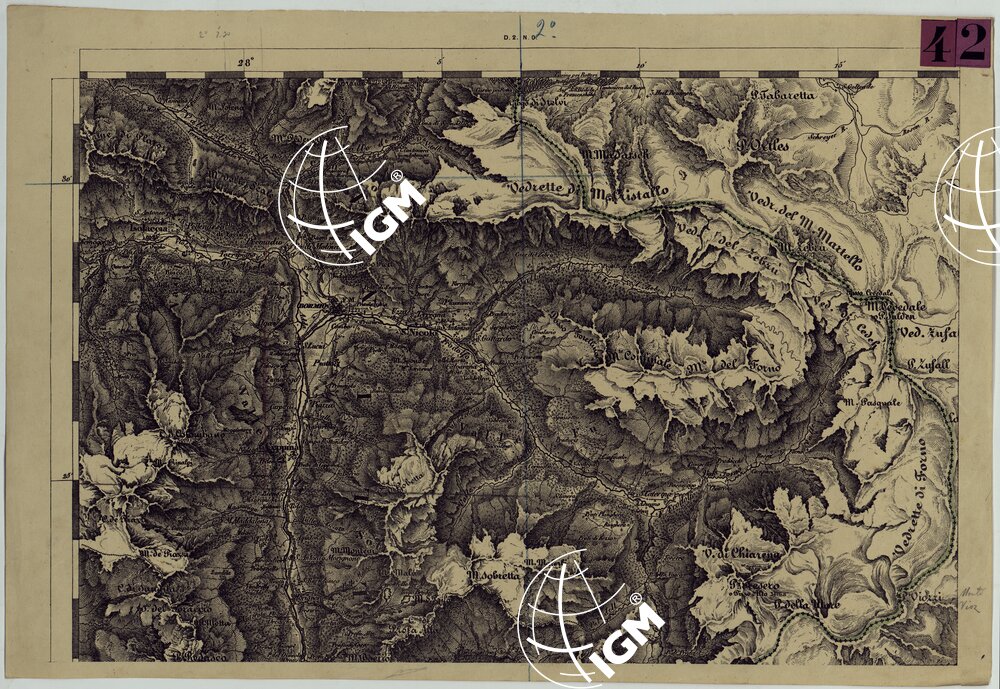 Ingrandimento meccanico al 50.000 delle carte alla scala di 1:86.400 pubblicate dall’Istituo Geografico Militare Austriaco. Lavoro ordinato dal Comando dello S.M. Italiano e lasciato interotto.