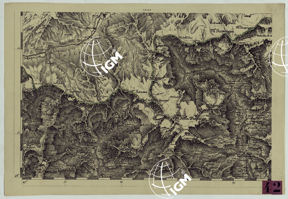 Ingrandimento meccanico al 50.000 delle carte alla scala di 1:86.400 pubblicate dall’I.G.M. Austriaco. Lavoro ordinato dal Comando dello S.M. Italiano e lasciato interotto.