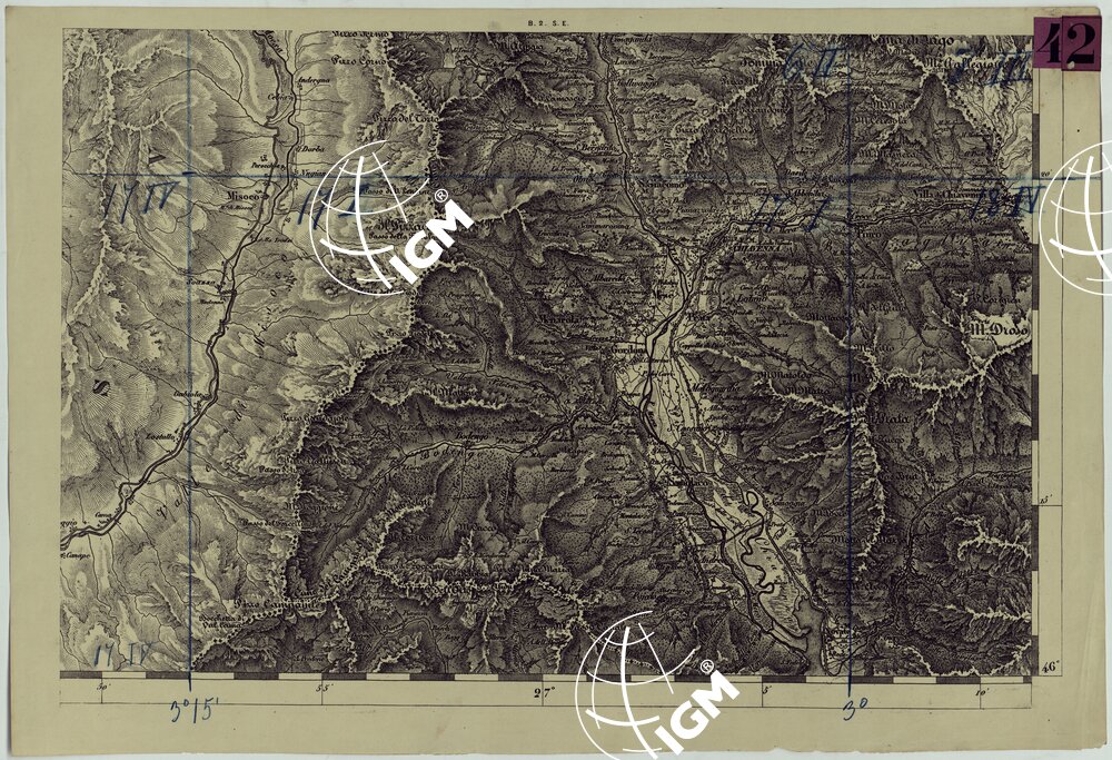 Ingrandimento meccanico al 50.000 delle carte alla scala di 1:86.400 pubblicate dall’I.G.M. Austriaco. Lavoro ordinato dal Comando dello S.M. Italiano e lasciato interotto.