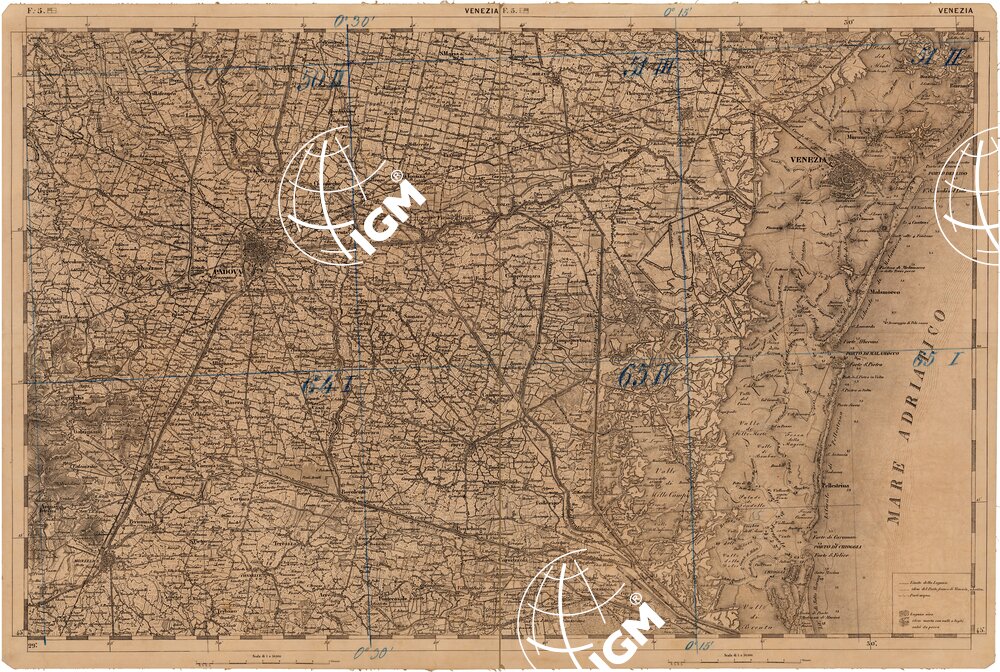 Ingrandimento meccanico al 50.000 delle carte alla scala di 1:86.400 pubblicate dall'I.G.M. Austriaco. Lavoro ordinato dal Comando dello S.M. Italiano e lasciato interotto.