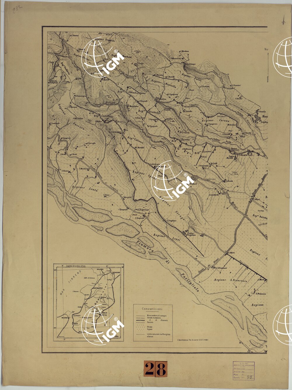Carta in due fogli stampati in nero con orografia dimostrata a mezzo di curve di livello tracciate all’equidistanza di m. 5. Essa indica le varie necropoli greche e romane, i ruderi e i resti dell’antica città calabra presso Gerace. Rilievo e disegno furono eseguiti dal Topografo G. de Notaris.