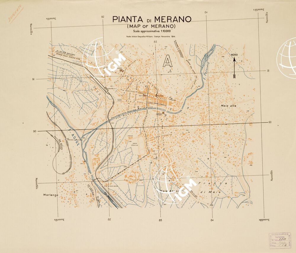 Rappresentazione orografica planimetrica. Ed. I.G.M. (FI). La scala 1:10.000 è approssimativa. Con lo stesso numero d’ inventario “Town plan of Merano ” edizione del 1945.