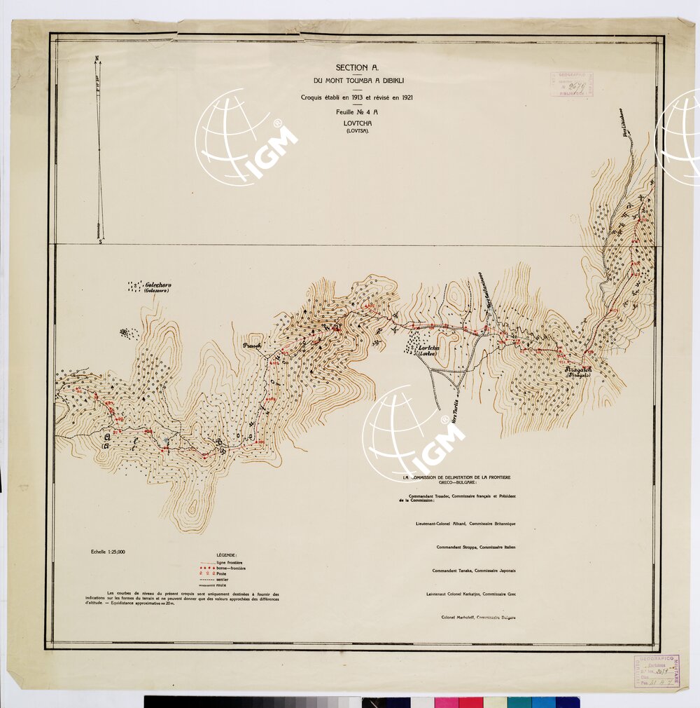 Autore Commissione Confini. Rappresentazione orografica a curve di livello. Editore Imprimerie D’ Etat – Luogo di edizione Sofia. Grafia francese locale. Tipologia policroma.