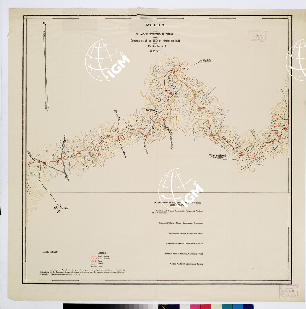 Autore Commissione Confini. Rappresentazione orografica a curve di livello. Editore Imprimerie D’ Etat – Luogo di edizione Sofia. Grafia francese locale. Tipologia policroma.