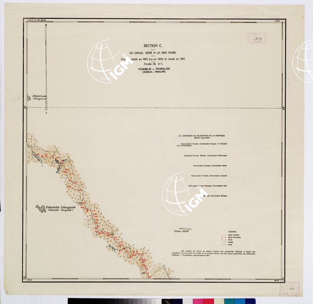 Autore Commissione Confini. Rappresentazione orografica a curve di livello. Editore Imprimerie D’ Etat – Luogo di edizione Sofia. Grafia francese locale. Tipologia policroma.