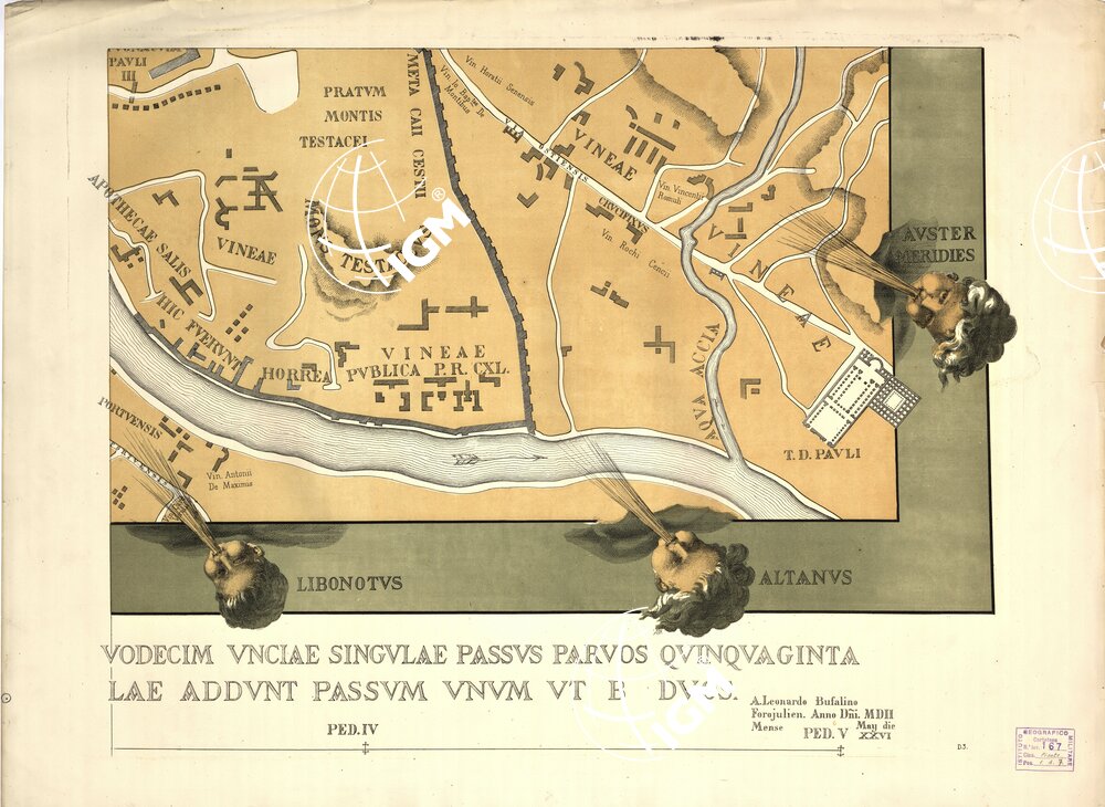Di questa pianta, che è di particolare importanza per la topografia degli edifici antichi ancora esistenti nel secolo XVI, si conosceva fino al 1874 l’unico esemplare incompleto della Biblioteca Barberiniana. Un esemplare completo, disegnato a penna e leggermente colorito con tinte che indicano i confini delle valli, dei colli e delle rive del Tevere, ricavato da quello che servì da originale all’incisione in legno, (Edita per Magistrum Leonardum die XXVI Mense Maij Anno Domini MDLI), fu rinvenuto, in quell’anno, nel già Convento della Madonna degli Angioli in Cuneo. Questo esemplare differisce da quello Barberiniano in quanto non reca attorno al campo disegnati gli stemmi, la menzione dei privilegi accordati per la impressione, il ritratto del Bufalini, la dedica ai Conservatori in Roma da Antonio Trevisi nel 1560, né i motivi ornamentali. Inoltre v’è la variante della data alterata dall’anno MDLI all’anno MDII ciò che però è da attribuirsi ad errore. Questa pianta venne riprodotta per la prima volta nel 1879 per il natale di Roma e per la cinquantesima ricorrenza della fondazione dell’Istituto Archeologico Germanico, dal Ministero della Pubblica Istruzione. Una seconda riproduzione è questa, ridotta a metà scala, dell’I.G.M., eseguita per la 7^ Conferenza Geodetica Internazionale di quell’anno. La riproduzione si compone di sei fogli in cromo ed un quadro d’unione in nero. Annessa una notizia illustrativa.