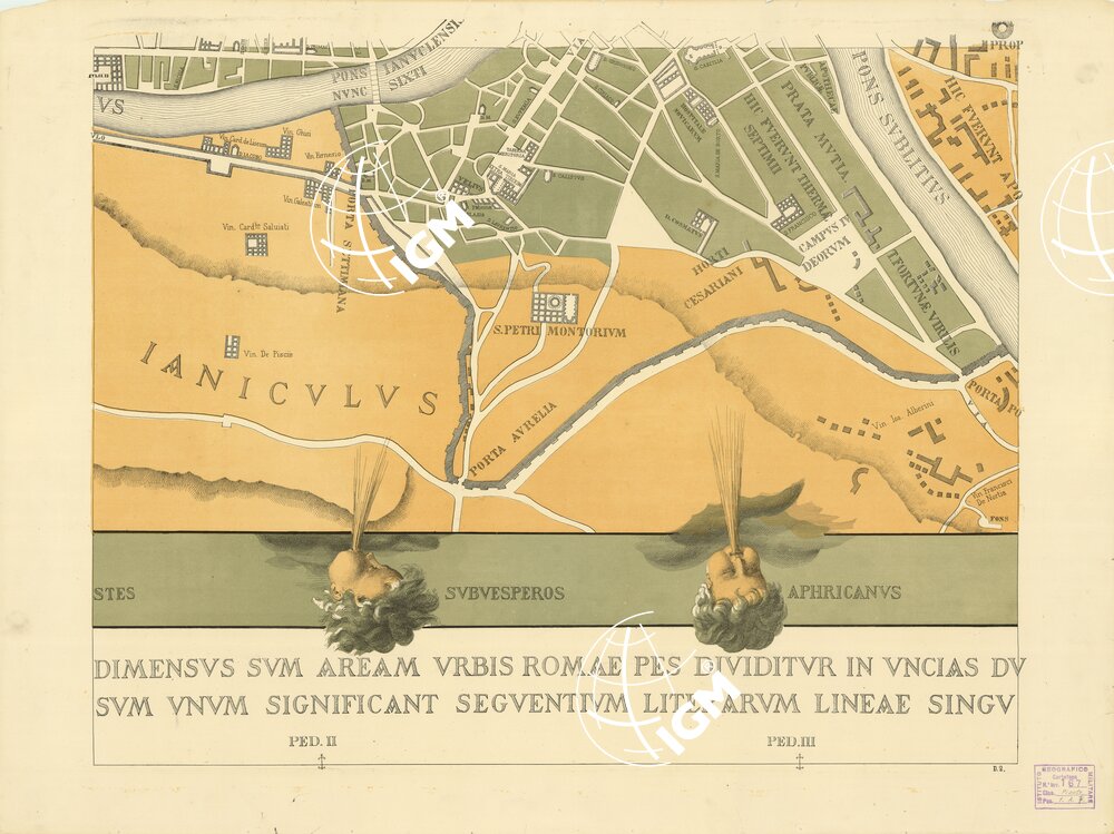 Di questa pianta, che è di particolare importanza per la topografia degli edifici antichi ancora esistenti nel secolo XVI, si conosceva fino al 1874 l’unico esemplare incompleto della Biblioteca Barberiniana. Un esemplare completo, disegnato a penna e leggermente colorito con tinte che indicano i confini delle valli, dei colli e delle rive del Tevere, ricavato da quello che servì da originale all’incisione in legno, (Edita per Magistrum Leonardum die XXVI Mense Maij Anno Domini MDLI), fu rinvenuto, in quell’anno, nel già Convento della Madonna degli Angioli in Cuneo. Questo esemplare differisce da quello Barberiniano in quanto non reca attorno al campo disegnati gli stemmi, la menzione dei privilegi accordati per la impressione, il ritratto del Bufalini, la dedica ai Conservatori in Roma da Antonio Trevisi nel 1560, né i motivi ornamentali. Inoltre v’è la variante della data alterata dall’anno MDLI all’anno MDII ciò che però è da attribuirsi ad errore. Questa pianta venne riprodotta per la prima volta nel 1879 per il natale di Roma e per la cinquantesima ricorrenza della fondazione dell’Istituto Archeologico Germanico, dal Ministero della Pubblica Istruzione. Una seconda riproduzione è questa, ridotta a metà scala, dell’I.G.M., eseguita per la 7^ Conferenza Geodetica Internazionale di quell’anno. La riproduzione si compone di sei fogli in cromo ed un quadro d’unione in nero. Annessa una notizia illustrativa.