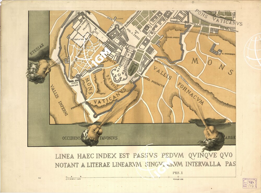 Di questa pianta, che è di particolare importanza per la topografia degli edifici antichi ancora esistenti nel secolo XVI, si conosceva fino al 1874 l’unico esemplare incompleto della Biblioteca Barberiniana. Un esemplare completo, disegnato a penna e leggermente colorito con tinte che indicano i confini delle valli, dei colli e delle rive del Tevere, ricavato da quello che servì da originale all’incisione in legno, (Edita per Magistrum Leonardum die XXVI Mense Maij Anno Domini MDLI), fu rinvenuto, in quell’anno, nel già Convento della Madonna degli Angioli in Cuneo. Questo esemplare differisce da quello Barberiniano in quanto non reca attorno al campo disegnati gli stemmi, la menzione dei privilegi accordati per la impressione, il ritratto del Bufalini, la dedica ai Conservatori in Roma da Antonio Trevisi nel 1560, né i motivi ornamentali. Inoltre v’è la variante della data alterata dall’anno MDLI all’anno MDII ciò che però è da attribuirsi ad errore. Questa pianta venne riprodotta per la prima volta nel 1879 per il natale di Roma e per la cinquantesima ricorrenza della fondazione dell’Istituto Archeologico Germanico, dal Ministero della Pubblica Istruzione. Una seconda riproduzione è questa, ridotta a metà scala, dell’I.G.M., eseguita per la 7^ Conferenza Geodetica Internazionale di quell’anno. La riproduzione si compone di sei fogli in cromo ed un quadro d’unione in nero. Annessa una notizia illustrativa.