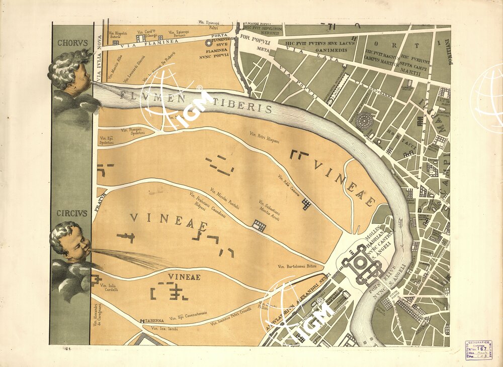 Di questa pianta, che è di particolare importanza per la topografia degli edifici antichi ancora esistenti nel secolo XVI, si conosceva fino al 1874 l’unico esemplare incompleto della Biblioteca Barberiniana. Un esemplare completo, disegnato a penna e leggermente colorito con tinte che indicano i confini delle valli, dei colli e delle rive del Tevere, ricavato da quello che servì da originale all’incisione in legno, (Edita per Magistrum Leonardum die XXVI Mense Maij Anno Domini MDLI), fu rinvenuto, in quell’anno, nel già Convento della Madonna degli Angioli in Cuneo. Questo esemplare differisce da quello Barberiniano in quanto non reca attorno al campo disegnati gli stemmi, la menzione dei privilegi accordati per la impressione, il ritratto del Bufalini, la dedica ai Conservatori in Roma da Antonio Trevisi nel 1560, né i motivi ornamentali. Inoltre v’è la variante della data alterata dall’anno MDLI all’anno MDII ciò che però è da attribuirsi ad errore. Questa pianta venne riprodotta per la prima volta nel 1879 per il natale di Roma e per la cinquantesima ricorrenza della fondazione dell’Istituto Archeologico Germanico, dal Ministero della Pubblica Istruzione. Una seconda riproduzione è questa, ridotta a metà scala, dell’I.G.M., eseguita per la 7^ Conferenza Geodetica Internazionale di quell’anno. La riproduzione si compone di sei fogli in cromo ed un quadro d’unione in nero. Annessa una notizia illustrativa.