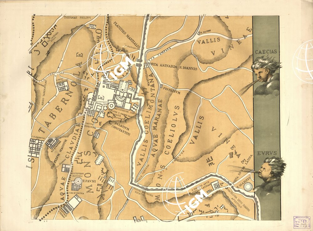 Di questa pianta, che è di particolare importanza per la topografia degli edifici antichi ancora esistenti nel secolo XVI, si conosceva fino al 1874 l’unico esemplare incompleto della Biblioteca Barberiniana. Un esemplare completo, disegnato a penna e leggermente colorito con tinte che indicano i confini delle valli, dei colli e delle rive del Tevere, ricavato da quello che servì da originale all’incisione in legno, (Edita per Magistrum Leonardum die XXVI Mense Maij Anno Domini MDLI), fu rinvenuto, in quell’anno, nel già Convento della Madonna degli Angioli in Cuneo. Questo esemplare differisce da quello Barberiniano in quanto non reca attorno al campo disegnati gli stemmi, la menzione dei privilegi accordati per la impressione, il ritratto del Bufalini, la dedica ai Conservatori in Roma da Antonio Trevisi nel 1560, né i motivi ornamentali. Inoltre v’è la variante della data alterata dall’anno MDLI all’anno MDII ciò che però è da attribuirsi ad errore. Questa pianta venne riprodotta per la prima volta nel 1879 per il natale di Roma e per la cinquantesima ricorrenza della fondazione dell’Istituto Archeologico Germanico, dal Ministero della Pubblica Istruzione. Una seconda riproduzione è questa, ridotta a metà scala, dell’I.G.M., eseguita per la 7^ Conferenza Geodetica Internazionale di quell’anno. La riproduzione si compone di sei fogli in cromo ed un quadro d’unione in nero. Annessa una notizia illustrativa.
