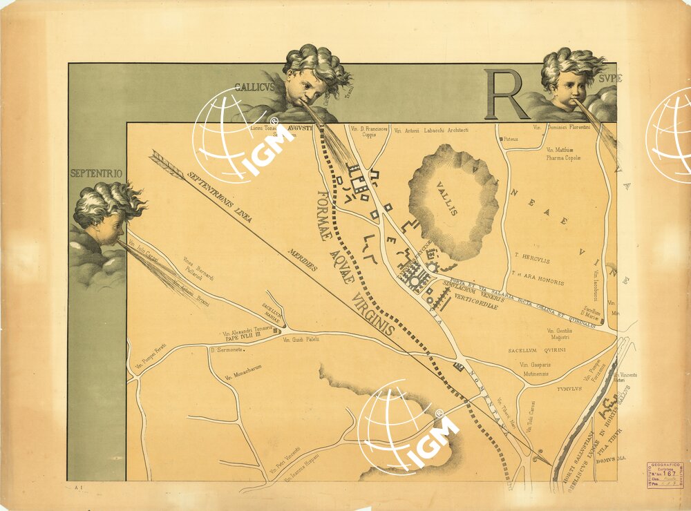 Di questa pianta, che è di particolare importanza per la topografia degli edifici antichi ancora esistenti nel secolo XVI, si conosceva fino al 1874 l’unico esemplare incompleto della Biblioteca Barberiniana. Un esemplare completo, disegnato a penna e leggermente colorito con tinte che indicano i confini delle valli, dei colli e delle rive del Tevere, ricavato da quello che servì da originale all’incisione in legno, (Edita per Magistrum Leonardum die XXVI Mense Maij Anno Domini MDLI), fu rinvenuto, in quell’anno, nel già Convento della Madonna degli Angioli in Cuneo. Questo esemplare differisce da quello Barberiniano in quanto non reca attorno al campo disegnati gli stemmi, la menzione dei privilegi accordati per la impressione, il ritratto del Bufalini, la dedica ai Conservatori in Roma da Antonio Trevisi nel 1560, né i motivi ornamentali. Inoltre v’è la variante della data alterata dall’anno MDLI all’anno MDII ciò che però è da attribuirsi ad errore. Questa pianta venne riprodotta per la prima volta nel 1879 per il natale di Roma e per la cinquantesima ricorrenza della fondazione dell’Istituto Archeologico Germanico, dal Ministero della Pubblica Istruzione. Una seconda riproduzione è questa, ridotta a metà scala, dell’I.G.M., eseguitaper la 7^ Conferenza Geodetica Internazionale di quell’anno. La riproduzione si compone di sei fogli in cromo ed un quadro d’unione in nero. Annessa una notizia illustrativa.