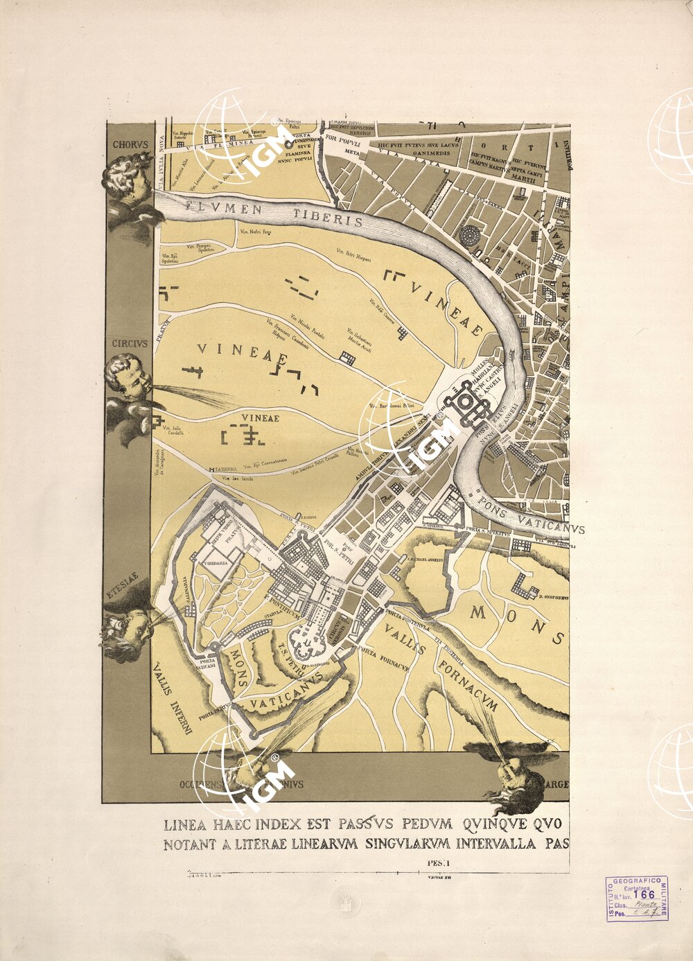 Di questa pianta, che è di particolare importanza per la topografia degli edifici antichi ancora esistenti nel secolo XVI, si conosceva fino al 1874 l’unico esemplare incompleto della Biblioteca Barberiniana. Un esemplare completo, disegnato a penna e leggermente colorito con tinte che indicano i confini delle valli, dei colli e delle rive del Tevere, ricavato da quello che servì da originale all’incisione in legno, (Edita per Magistrum Leonardum die XXVI Mense Maij Anno Domini MDLI), fu rinvenuto, in quell’anno, nel già Convento della Madonna degli Angioli in Cuneo. Questo esemplare differisce da quello Barberiniano in quanto non reca attorno al campo disegnati gli stemmi, la menzione dei privilegi accordati per la impressione, il ritratto del Bufalini, la dedica ai Conservatori in Roma da Antonio Trevisi nel 1560, né i motivi ornamentali. Inoltre v’è la variante della data alterata dall’anno MDLI all’anno MDII ciò che però è da attribuirsi ad errore. Questa pianta venne riprodotta per la prima volta nel 1879 per il natale di Roma e per la cinquantesima ricorrenza della fondazione dell’Istituto Archeologico Germanico, dal Ministero della Pubblica Istruzione. Una seconda riproduzione è questa, ridotta a metà scala, dell’I.G.M., eseguita per la 7^ Conferenza Geodetica Internazionale di quell’anno. La riproduzione si compone di sei fogli in cromo ed un quadro d’unione in nero. Annessa una notizia illustrativa.
