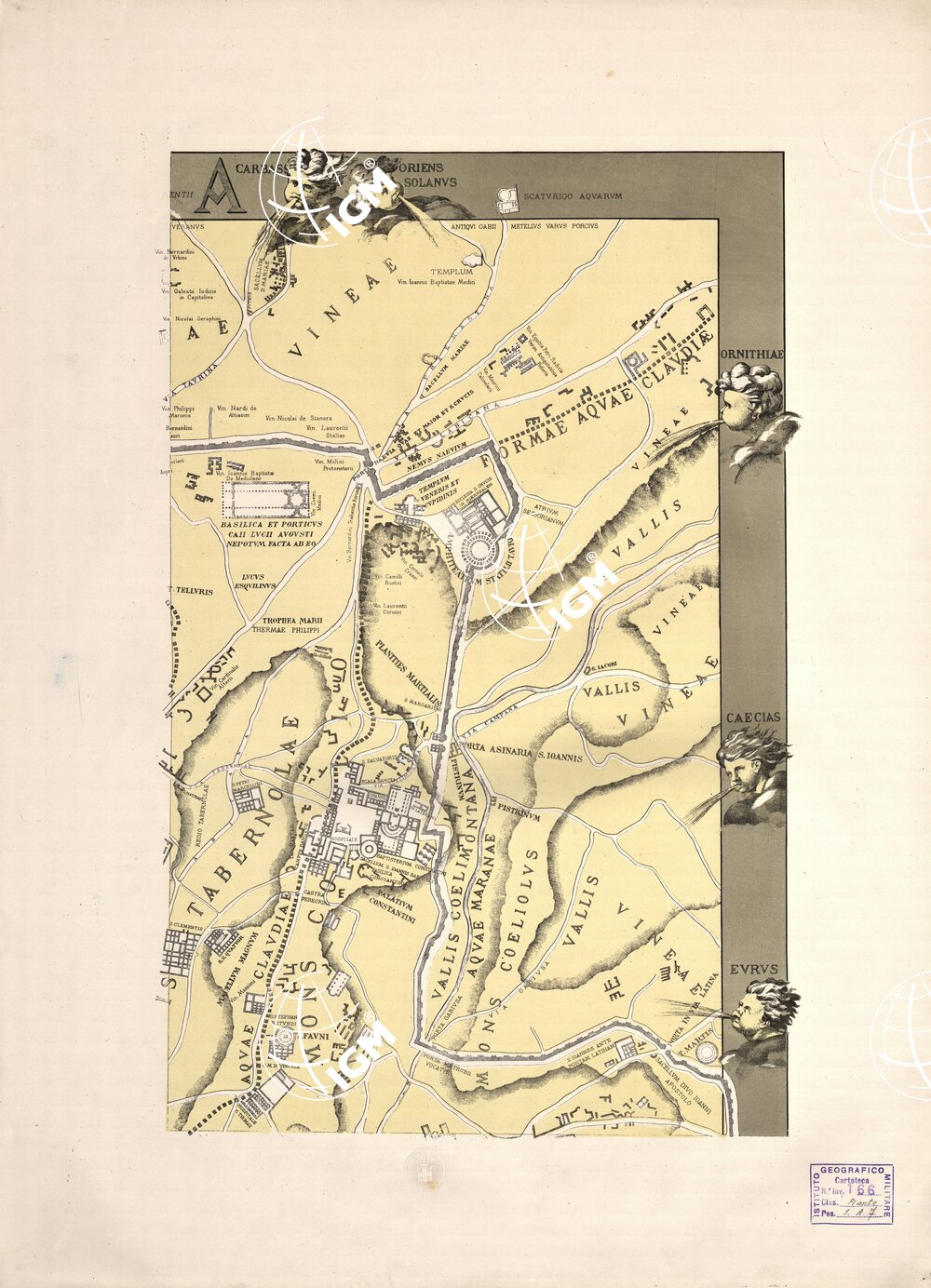 Di questa pianta, che è di particolare importanza per la topografia degli edifici antichi ancora esistenti nel secolo XVI, si conosceva fino al 1874 l’unico esemplare incompleto della Biblioteca Barberiniana. Un esemplare completo, disegnato a penna e leggermente colorito con tinte che indicano i confini delle valli, dei colli e delle rive del Tevere, ricavato da quello che servì da originale all’incisione in legno, (Edita per Magistrum Leonardum die XXVI Mense Maij Anno Domini MDLI), fu rinvenuto, in quell’anno, nel già Convento della Madonna degli Angioli in Cuneo. Questo esemplare differisce da quello Barberiniano in quanto non reca attorno al campo disegnati gli stemmi, la menzione dei privilegi accordati per la impressione, il ritratto del Bufalini, la dedica ai Conservatori in Roma da Antonio Trevisi nel 1560, né i motivi ornamentali. Inoltre v’è la variante della data alterata dall’anno MDLI all’anno MDII ciò che però è da attribuirsi ad errore. Questa pianta venne riprodotta per la prima volta nel 1879 per il natale di Roma e per la cinquantesima ricorrenza della fondazione dell’Istituto Archeologico Germanico, dal Ministero della Pubblica Istruzione. Una seconda riproduzione è questa, ridotta a metà scala, dell’I.G.M., per la 7^ Conferenza Geodetica Internazionale di quell’anno. La riproduzione si compone di sei fogli in cromo ed un quadro d’unione in nero. Annessa una notizia illustrativa.