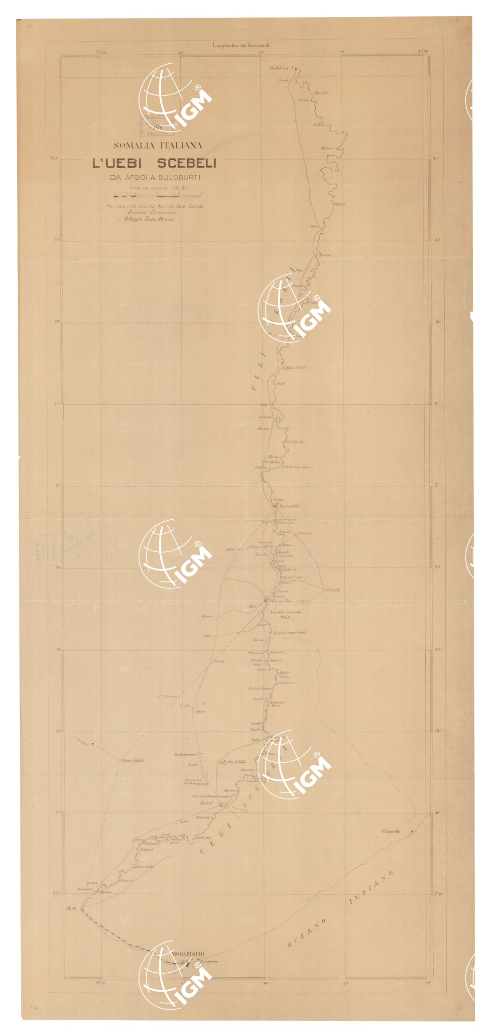 La carta è in foglio unico costruita sulla base di determinazioni di operatori della R. Marina durante i primi rilievi idrografici e su quelli di numerose altre determinazioni astronomiche e misure eseguite da S.A.R. il Duca degli Abruzzi e dai suoi operatori. Per i tratti Afgoi-Racheilo O. G. e Ghedo Bercan-Buloburti furono impiegati rilievi speditivi alla bussola, mentre il tratto Racheilo O. G. Ghedo Bercan fu ricavato da rilievo dell’I.G.M.