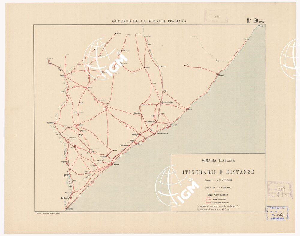 Un foglio che comprende la rete stradale della Somalia meridionale, da Giumbo e Itala, sulla costa, ai confini dell’interno. La rete è tracciata in rosso con distinzione delle strade carrozzabili (costruite e in costruzione), le carovaniere, i sentieri. Le distanze sono calcolate in ore di marcia. Il foglio fu inserito nella relazione del Sen. Nob. Giacomo De Martino ” La Somalia Italiana nei tre anni del mio Governo”, Roma, 1912. (Carlo Colombo, Tipografia della Camera dei Deputati).