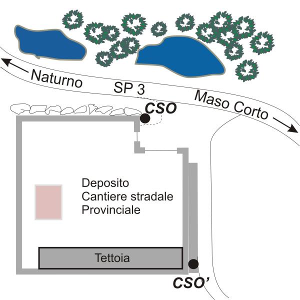| Contrassegni | [{"simbolo_contrassegno":"B1","materializzazione":"(CSO) – Bullone infisso nel muro delle fondamenta N\/O del cantiere del Servizio Strade della Provincia."},{"simbolo_contrassegno":"B4","materializzazione":"(CSO') – Centrino universale posto sul muro a nord del cantiere Provinciale."}] |