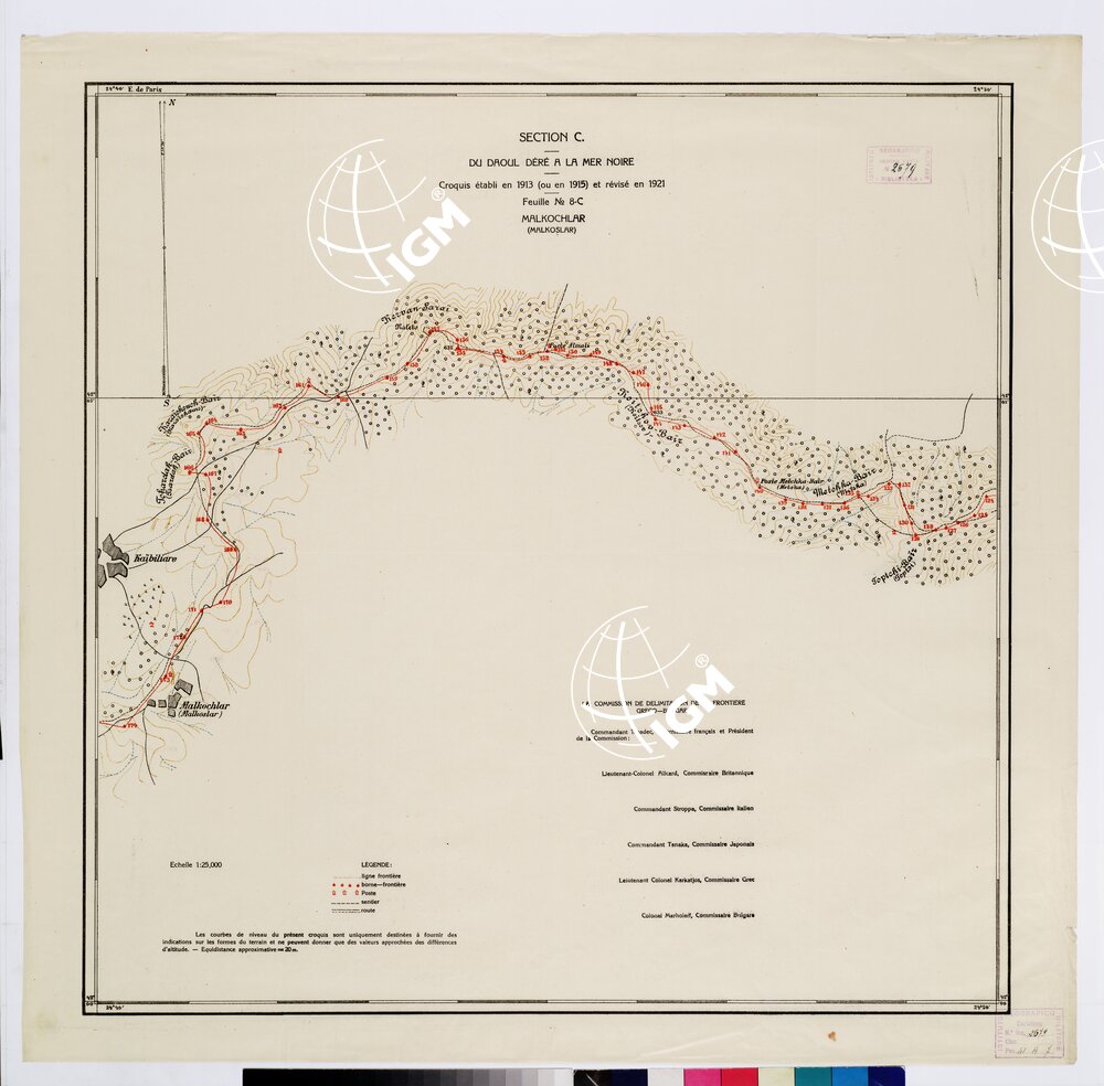 Autore Commissione Confini. Rappresentazione orografica a curve di livello. Editore Imprimerie D’ Etat – Luogo di edizione Sofia. Grafia francese locale. Tipologia policroma.