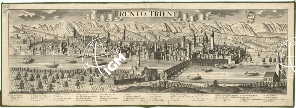 Epoca fine secolo XVIII.Dimensioni cm 31x 100. Prospetto di Milano. ” F. B. Werner delin. ; Joh Fried Probst excud. Aug. Vind “. In basso un elenco numerico dei principali edifici. Incisione su rame. Foglio unico montato su tela. Fa parte di un gruppo di sette carte dello stesso A. e dello stesso incisore.