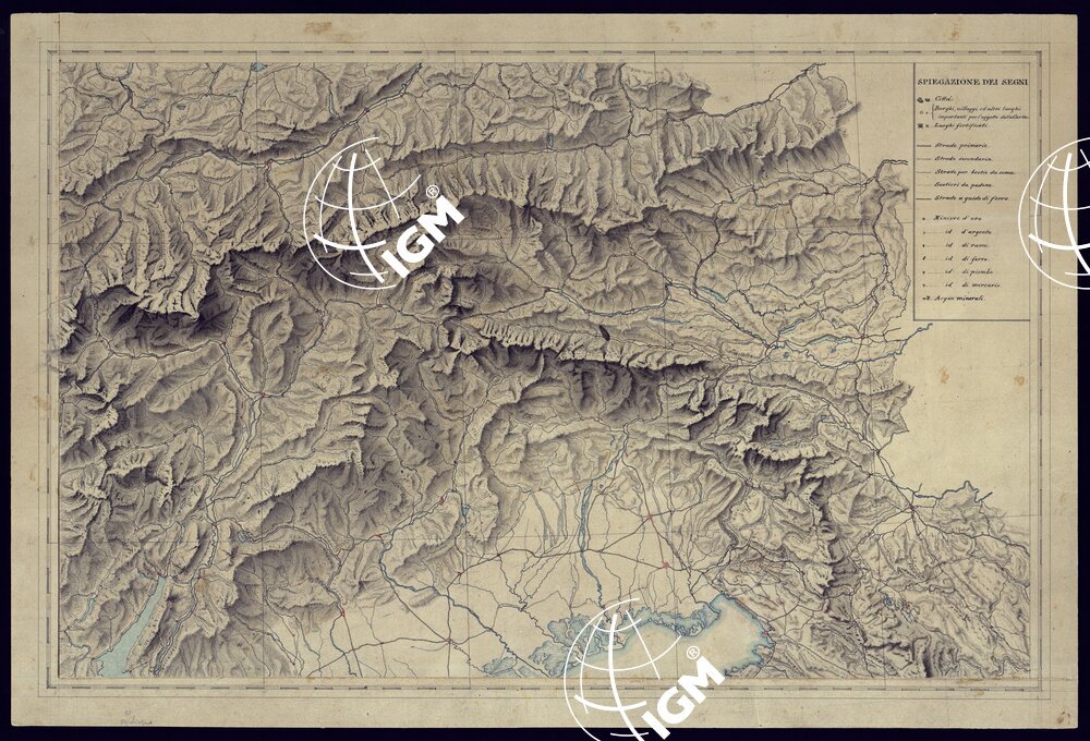 Il titolo non è presente sulla carta. Disegni accuratissimi acquerellati del celebre topografo Ing. Vittorio Brambilla con numerose indicazioni di carattere fisiografico e ricca nomenclatura, riproducenti il profilo geometrico della cerchia Alpina. Sono gli originali delle tavole che accompagnano l’opera;”Le Alpi che cingono l’Italia consideramilitarmente così nell’antica come, nella presente loro condizione” pubbliacata a Torino nel 1845, per cura del Quartier Maestro Generale dell’Esercito Sardo ANNIBALE DI SALUZZO.