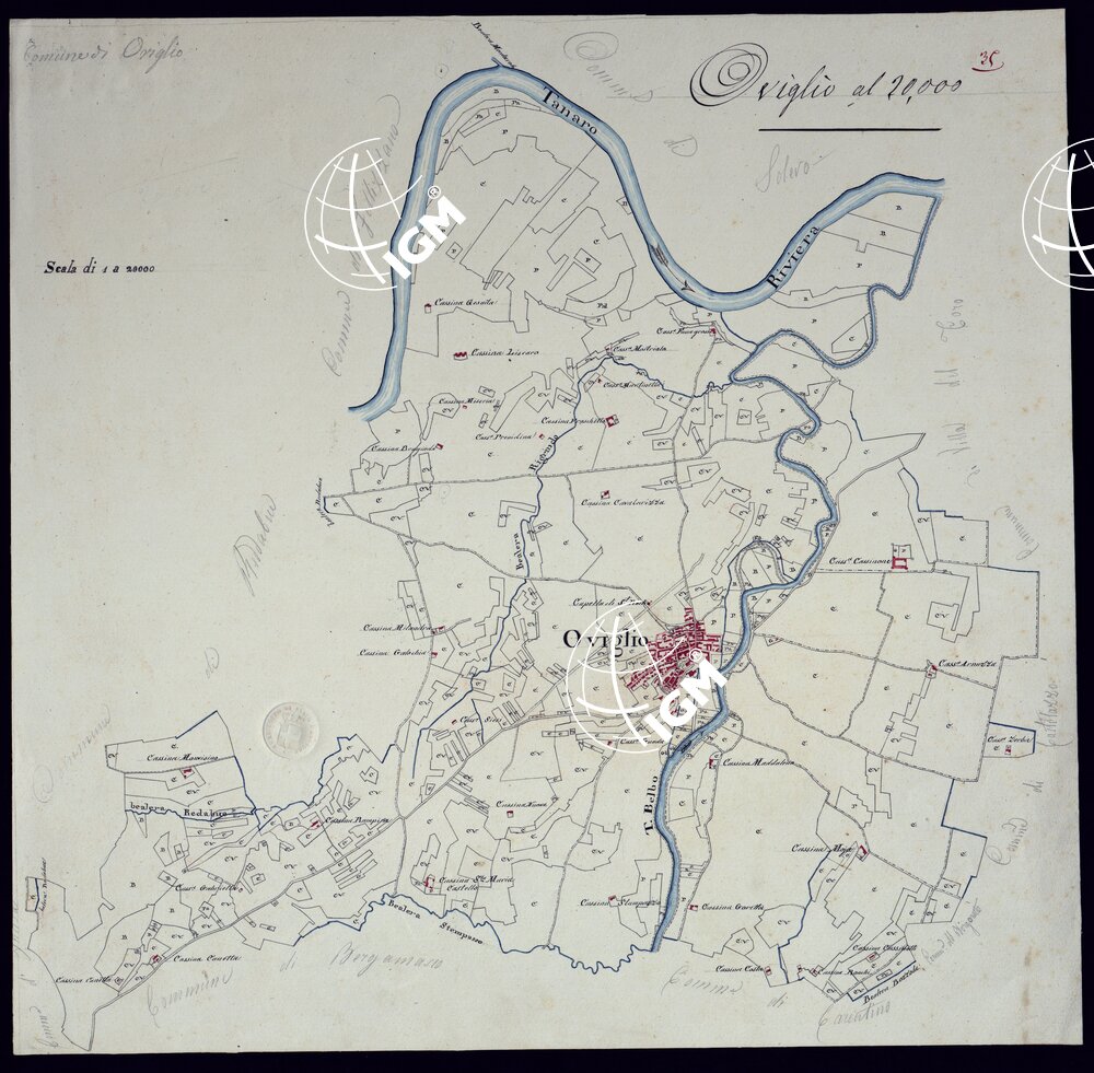 Gruppo di 51 mappe catastali di diversi comuni, impiegate con tutta probabilità per la costruzione della carta generale degli Stati Sardi al 50.000. Senza firma, eccetto due, firmate da Lagrange, una riduzione del piano catastale del territorio d’Ivrea firmato Valsecchi 1822, e una riproduzione dei piani catstali di comuni della provincia d’Ivrea firmata Cap. Roggero.