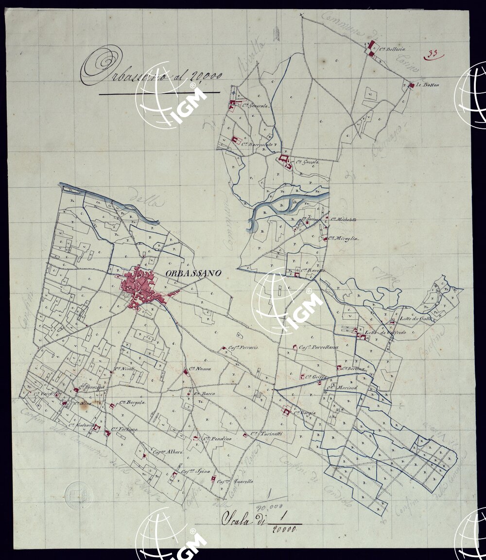 Gruppo di 51 mappe catastali di diversi comuni, impiegate con tutta probabilità per la costruzione della carta generale degli Stati Sardi al 50.000. Senza firma, eccetto due, firmate da Lagrange, una riduzione del piano catastale del territorio d’Ivrea firmate da Lagrange, una riduzione del piano catastale del territorio d’Ivrea firmate Valsecchi 1822, e una riproduzione dei piani catastali di comuni della provincia d’Ivrea firmata Cap. Roggero.