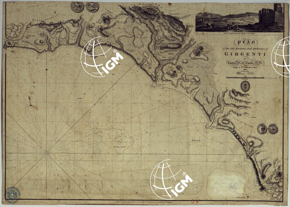 Docum. n. 13. Piano della città, dintorni ed ancoraggio di Girgenti rilevato dal Cap. Smyth, pubblicato dall’Ufficio Idrografico di Londra. Incisione su rame di G. Walker. L’orografia è rappresentata con tratteggio. Gli scandagli sono calcolati in fathoms. La scala grafica è calcolata in yards. In alto una veduta di Girgenti.