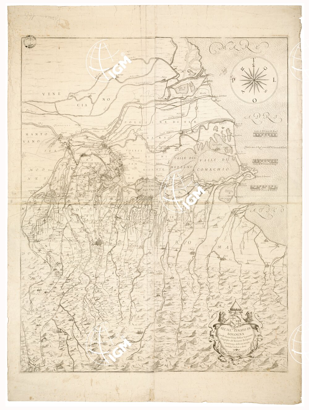 ALL’ILL.MO SENATO DI BOLOGNA CAMILLO SACENTI PERITO PUBLICO LA PRESENTE GEOGRAFIA DEL TERRITORIO BOLOGNESE IN TESTIMONIO DELLA SUA SERVITU’ HUMILISS.TE DEDICA E DONA DI NUOVO P.[ER] LE MUTAZIONI SEGUITE RIDOTTA AL STATO PRESENTE (s. d.).