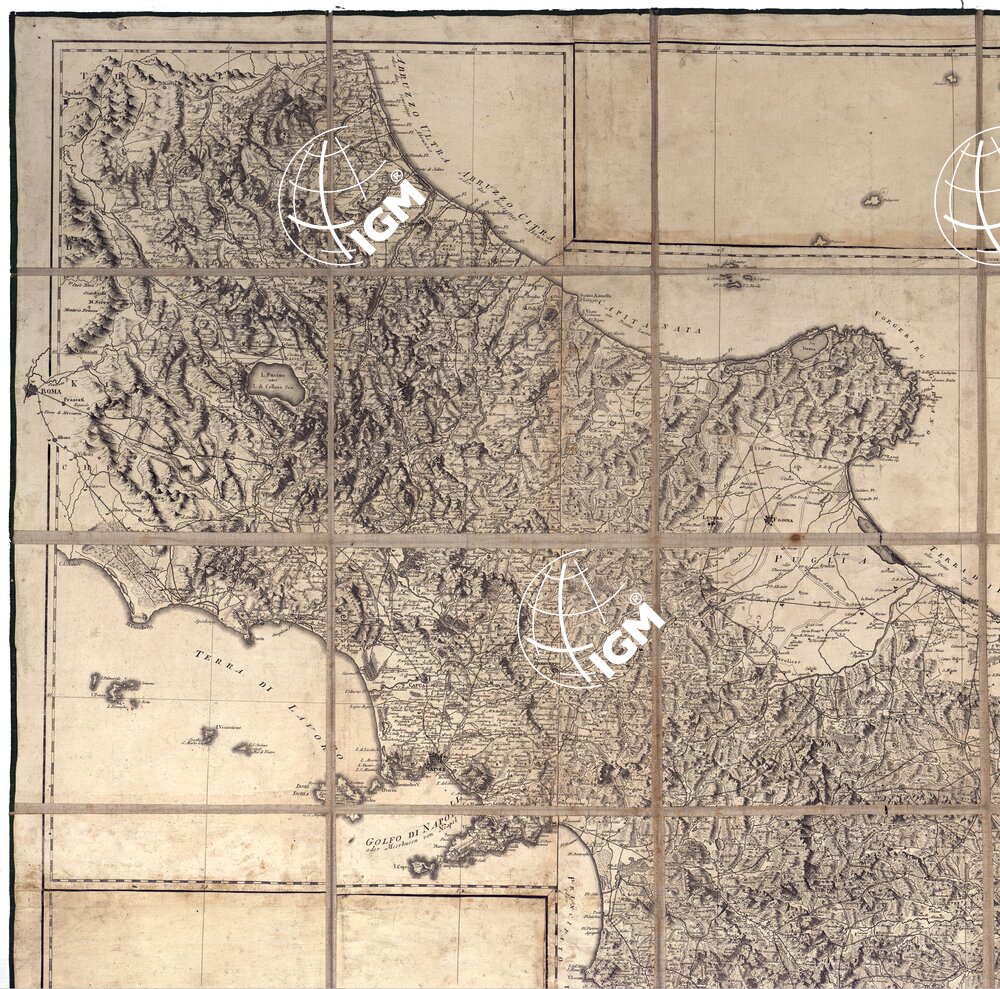 Grande carta incisa su rame composta dei quattro fogli della edizione austriaca completati da altri 4 fogli, riuniti e montati su tela a stacchi. In basso a destra cartina supplementare per l’isola di Malta e di Gozo alla scala 1:185.000 circa.