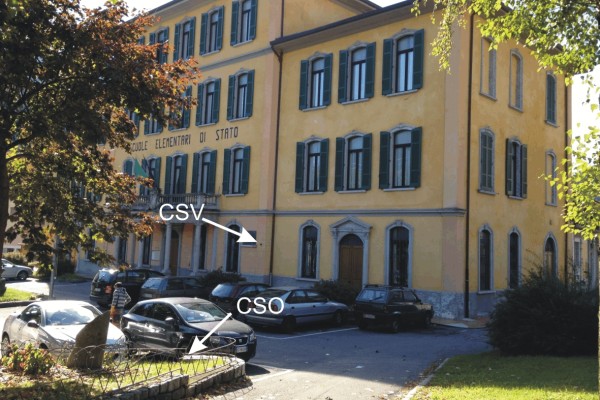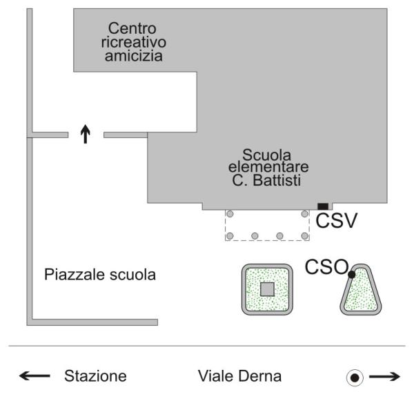 | Contrassegni | [{"simbolo_contrassegno":"B4","materializzazione":"(CSO) – Centrino infisso sulla sommit\u00e0 del muretto delimitante l'aiuola dove \u00e8 posta la lapide commemorativa, di fronte alle scuole elementari \"C. Battisti\"."},{"simbolo_contrassegno":"V1","materializzazione":"(CSV) – Mensola infissa sulla facciata principale delle scuole elementari C.Battisti, in prossimit\u00e0 dello spigolo di destra dell'avancorpo."}] |