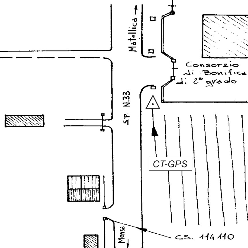 | Materializzazione | Centrino metallico infisso nel cordolo del tombino in cemento posto vicino allo spigolo della recinzione dell'idrovora di Bonifica di II grado per il Canale Emiliano Romagnolo lungo la S.P. 33 al km 1,400 circa. |