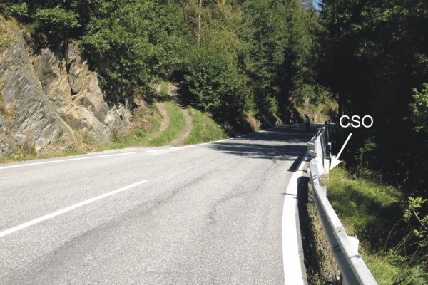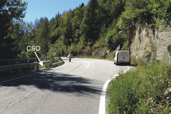 | Contrassegni | [{"simbolo_contrassegno":"B1","materializzazione":"(CSO) – Bullone infisso all'inizio del cordolo in cemento armato di ancoraggio del guard-rail, posto di fronte all'imbocco di una strada di campagna."}] |
